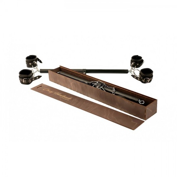 Распорка выполнена из дерева и обтянута натуральной кожей. По краям металлические кольца, к которым крепятся оковы. Посередине распорки находятся широкие металлические кольца, к которым присоединяются наручники